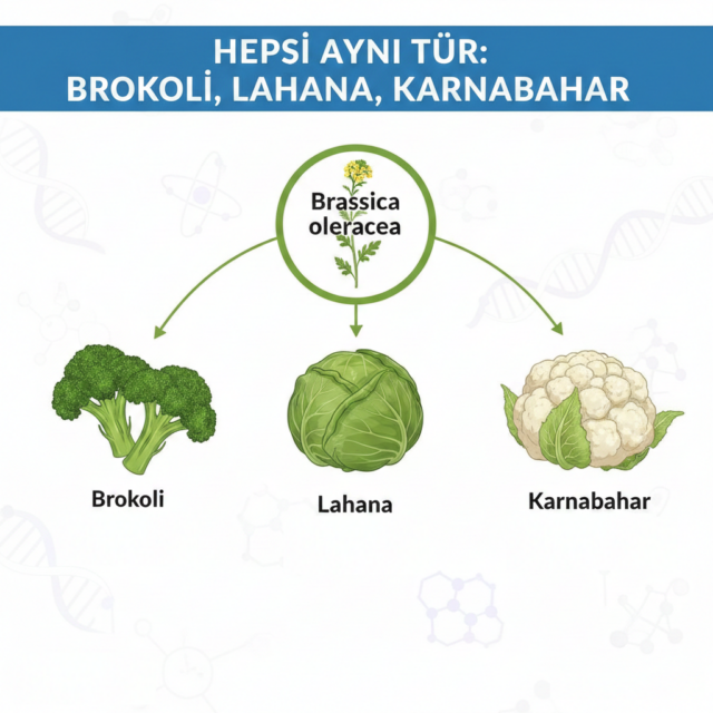 Evet yalnızca bir tür ama bu bir türe ait birden fazla tarım bitkisi yetiştirmekteyiz. Türün bilimsel adı; Brassica oleracea ve Türkçe adı ise ‘lahana’. Ama bizler bu türe ait (yani lahana türüne ait) mutfağımıza; brokoli, karnabahar, kale lahanası, top lahana, Brüksel lahanası, topbaş ve alabaş bitkilerini de koyarız. Evet tüm bu saydıklarımız hepsi aynı tür!